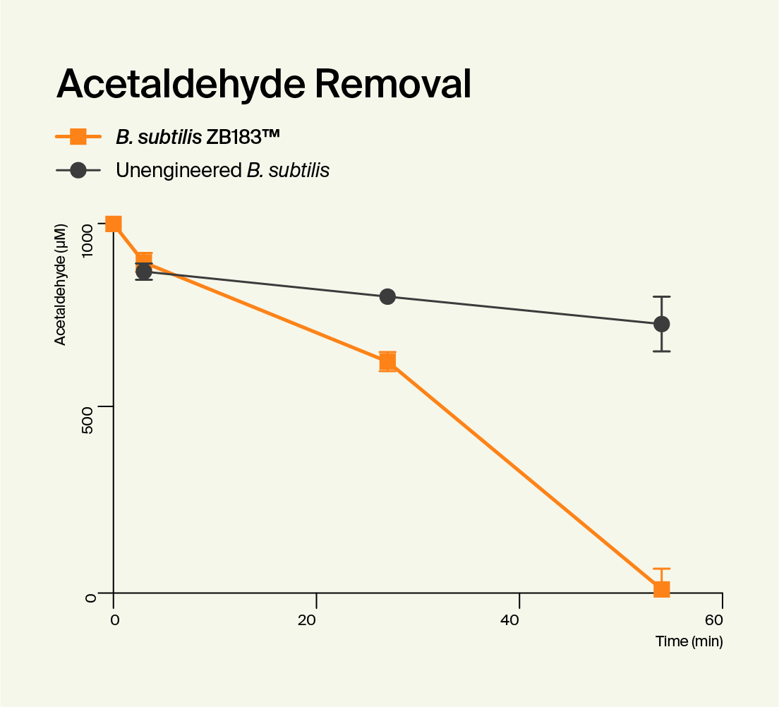 To confirm that ZB183™ worked as intended, we tested its ability to make ALDH and break down acetaldehyde. Over a series of laboratory tests where we compared it to the unedited B. subtilis strain, we confirmed that our Pre-Alcohol Probiotic was highly effective at producing ALDH. We also confirmed that while the control strain broke down almost no acetaldehyde, ZB183™ was able to break down more acetaldehyde than you could ever encounter when drinking.